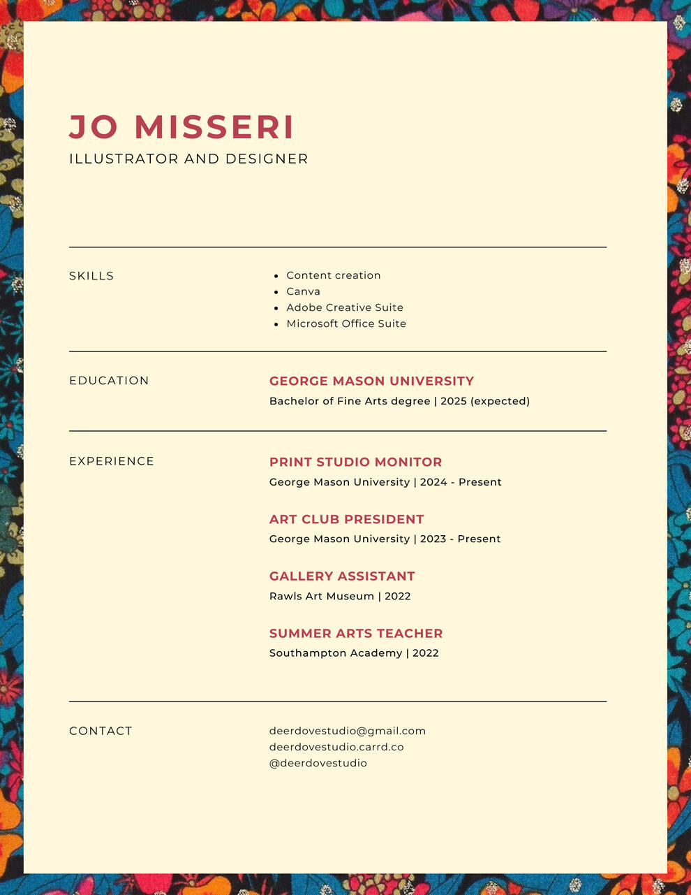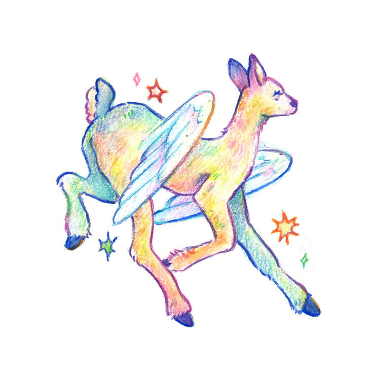 Jo Misseri is a Virginia-based artist creating illustrations, prints, and art books that depict vibrant, whimsical creatures and settings. Despite the cute and lively aesthetic of their work, they often create raw, emotional work informed by their struggles with loss, identity, and mental health. Animals, especially prey animals, are a core part of their visual language, since they’ve always felt a connection with them.Jo is currently pursuing a B.F.A in Art and Visual Technology at George Mason University. As the president of the Illustrators at Mason club, a student organization dedicated to advancing the arts at Mason, they volunteer their time planning and managing events for the 300+ members of the club as well as the broader public. They have created designs and posters to help advertise and further the club’s mission. While they have not shown their work in galleries, they share their art online and at artist alleys, such as George Mason’s Spring Artist Alley and Fairfax Comicon. They are currently focused on attending more community focused events like local artist markets and zine fairs and the work they are creating is in line with that.